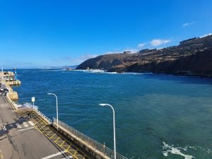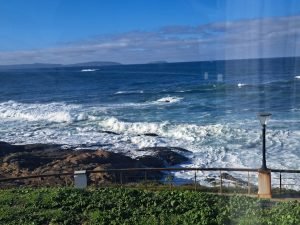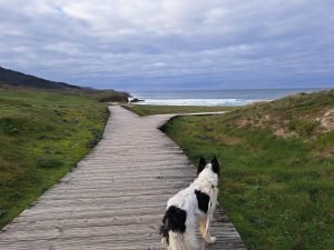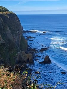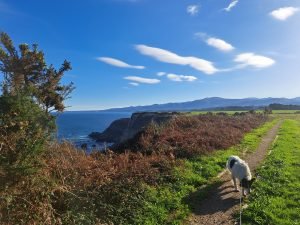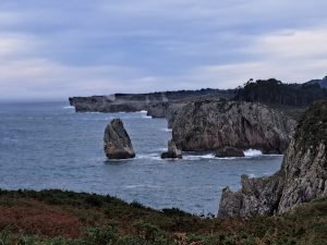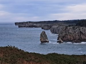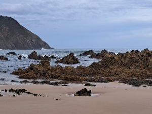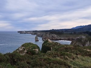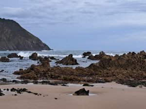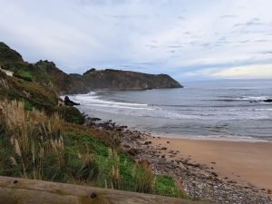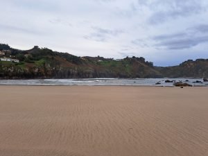Vi gik en lille tur, det var koldt og vekslende regn og sol, så vi var glade for det faste underlag der var på “strand promenaden”. For enden gik en trappe op til fine udsigt steder. Vi kunne også gå den anden vej og ende ved floden Nalón. På helle strækningen lå en fin sandstrand og tog imod havets bølger. Et betagende syn, uanset vind og vejr, men når vinden er hård og bølgerne er store er oplevelsen noget særligt.