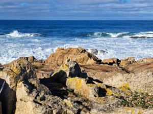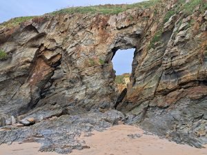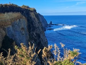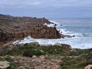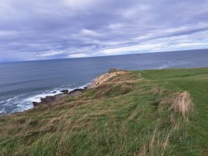 Den kystvandring var virkelig en oplevelse værd, især synet af bølgerne, der kæmpede mod klipperne. På et tidspunkt hørte vi en mærkelig lyd, der mindede om en ko, der puster luft ud af næsen. Vi forsøgte at finde lydens kilde og opdagede, at den kom fra huller i jorden. Græsset omkring hullerne bevægede sig synligt hver gang lyden opstod, som om luft blev blæst op gennem hullet.