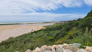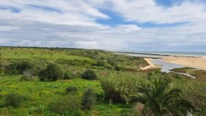 Fra kanten kan man se ud over Ria Formosa, lagunesystemet der skifter form med tidevandet, og de gyldne sandbanker, som dukker op og forsvinder som trĂŠkfugle. En sti fĂžrer ned mod kysten, men den var lidt for stejl til min smag. Toâben kiggede lĂŠnge og sukkede. Jeg tror, det var et godt suk.